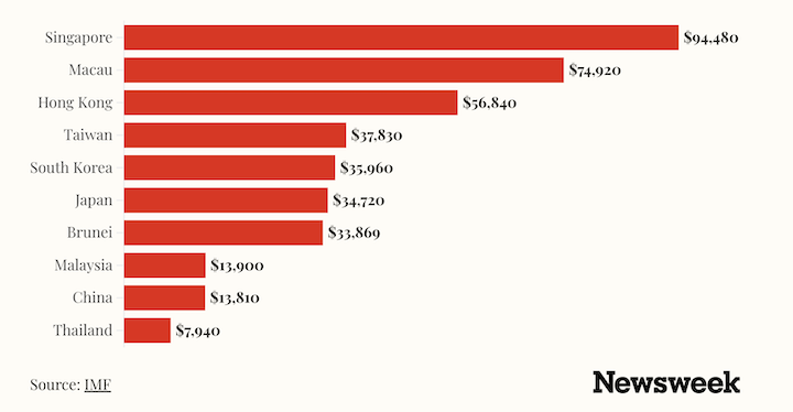 都市国家であり金融ハブでもあるシンガポールは、1人当たりGDPで突出した首位に立ち、9万4480ドルを記録した。この水準を上回るのは、世界でもリヒテンシュタイン、ルクセンブルク、スイス、アイスランドの4カ国のみだ。