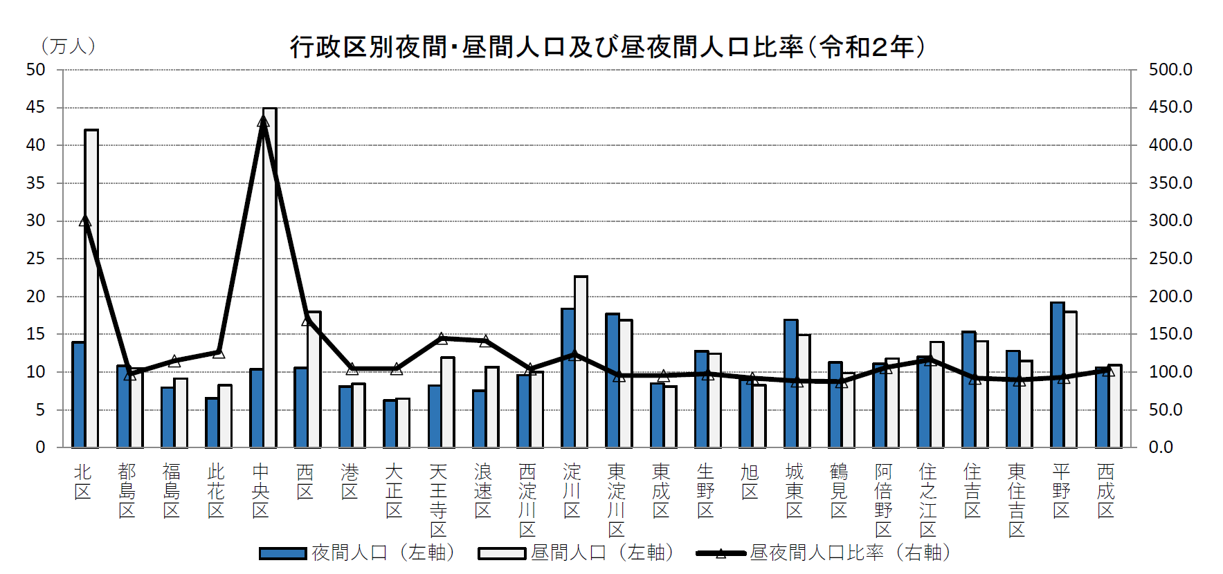 大阪も昼間人口が圧倒的に多い北区と中央区がその状態。