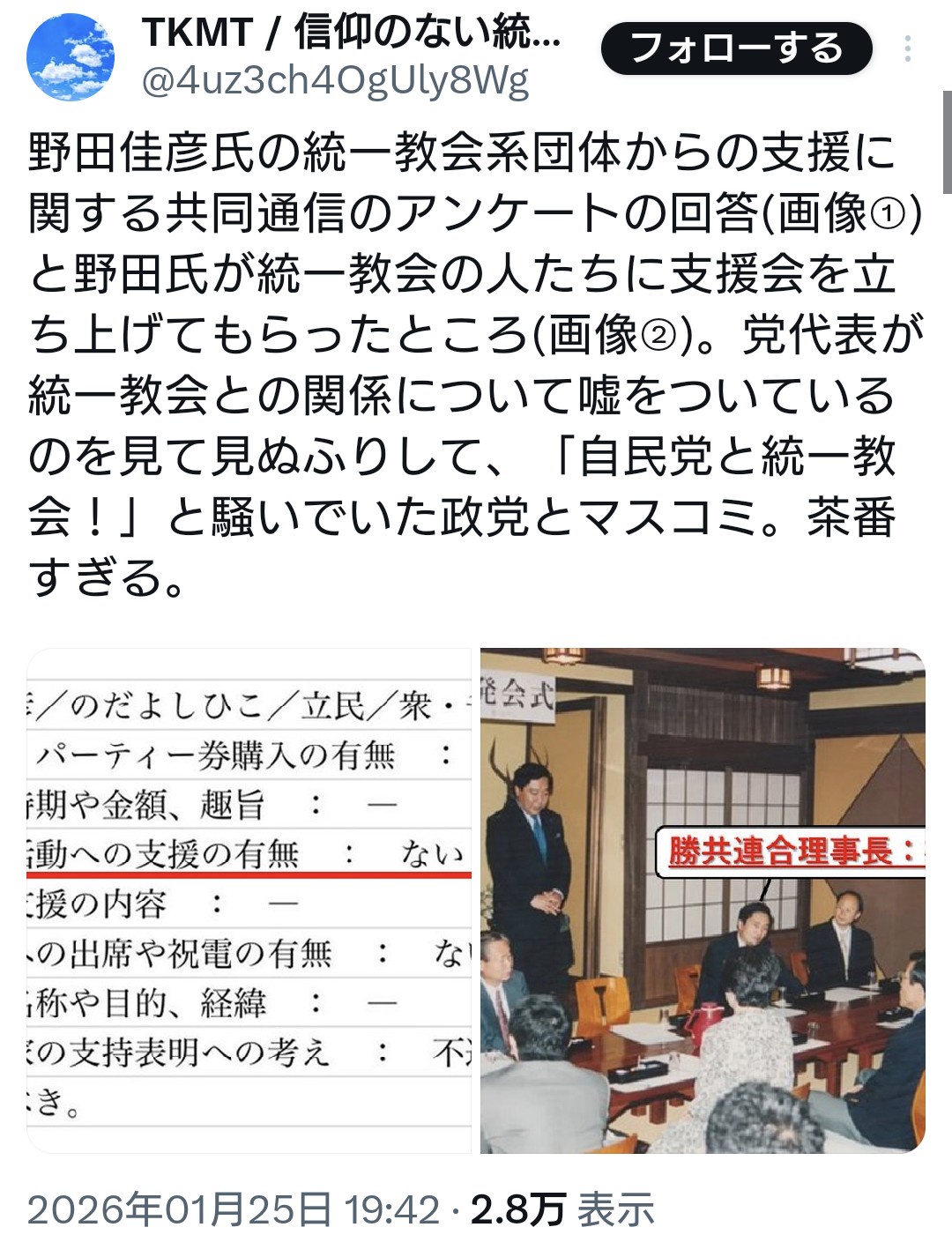 まあ壺連呼している連中が野田や立民議員には壺連呼しないわけだから、