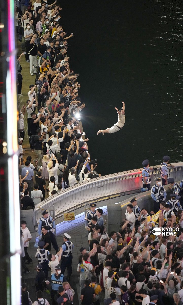 阪神の優勝を受けて道頓堀川に飛び込んだファンら=7日夜、大阪・ミナミ