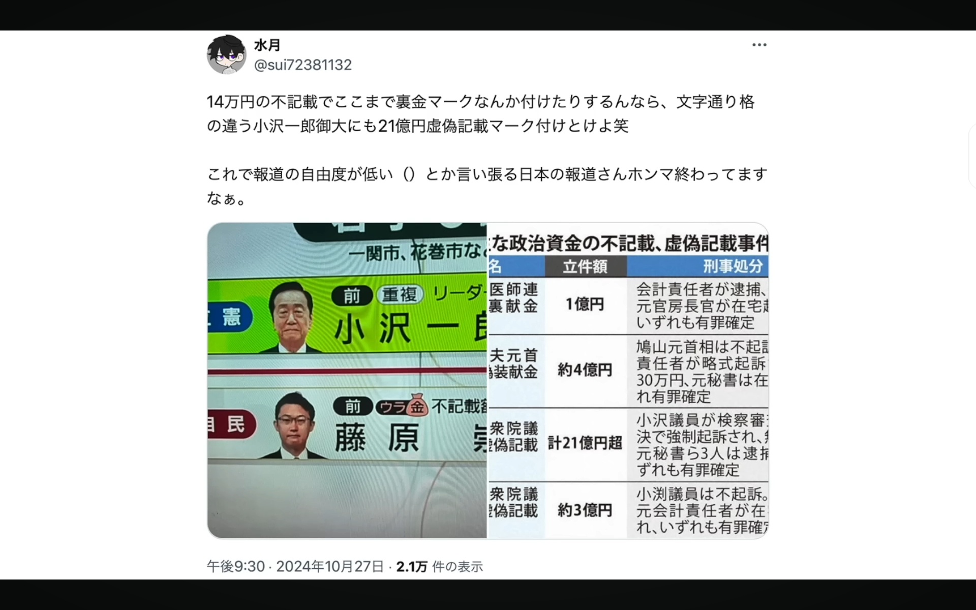 自民なら裏金、他党なら不記載とかマスゴミとアカのダブスタぶりに国民は呆れてるのがわからんのかな?
