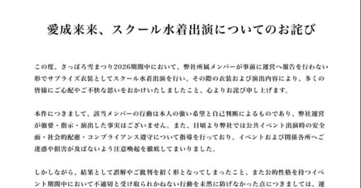 >本件につきまして、該当メンバーの行動は本人の強い希望と自己判断によるものであり、弊社運営が強要・指示・演出した事実はございません。