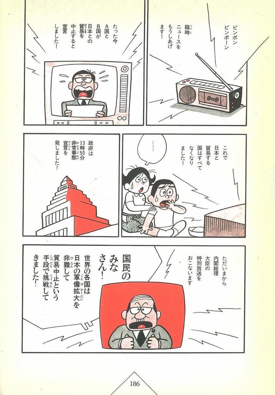 日本が軍備拡大→世界中の国が日本と貿易停止→日本が戦争開始(どこかへ攻める)