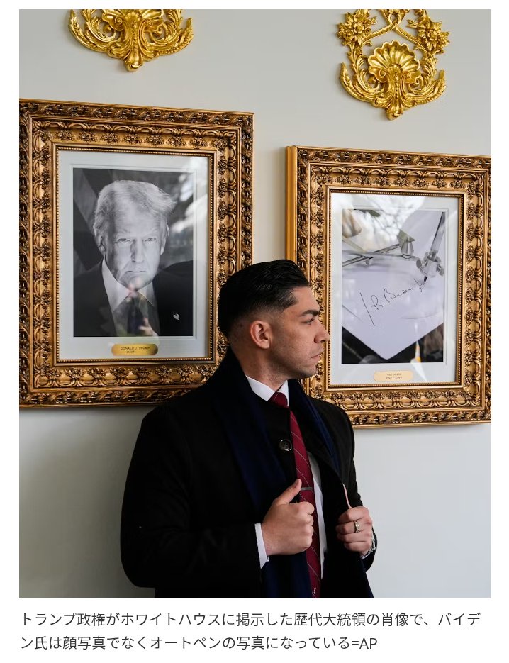 「額にはバイデン氏の肖像写真ではなく、自動署名機『オートペン』によるバイデン氏の署名の写真が収められています。トランプ氏はかつて、バイデン氏が自身の手ではなく、側近を使ってオートペンで公文書に署名させていたと批判。バイデン氏側はメディアのインタビューでこれを否定していました。このような経緯があり、ホワイトハウスは昨年9月のXで、バイデン氏の署名写真が、第一次政権と現在のトランプ氏の肖像写真で挟まれた画像を公開。要はバイデン氏を馬鹿にしているわけですが、当時、現地メディアではトランプ氏のアイデアによるものと報じられました」(政治部記者)