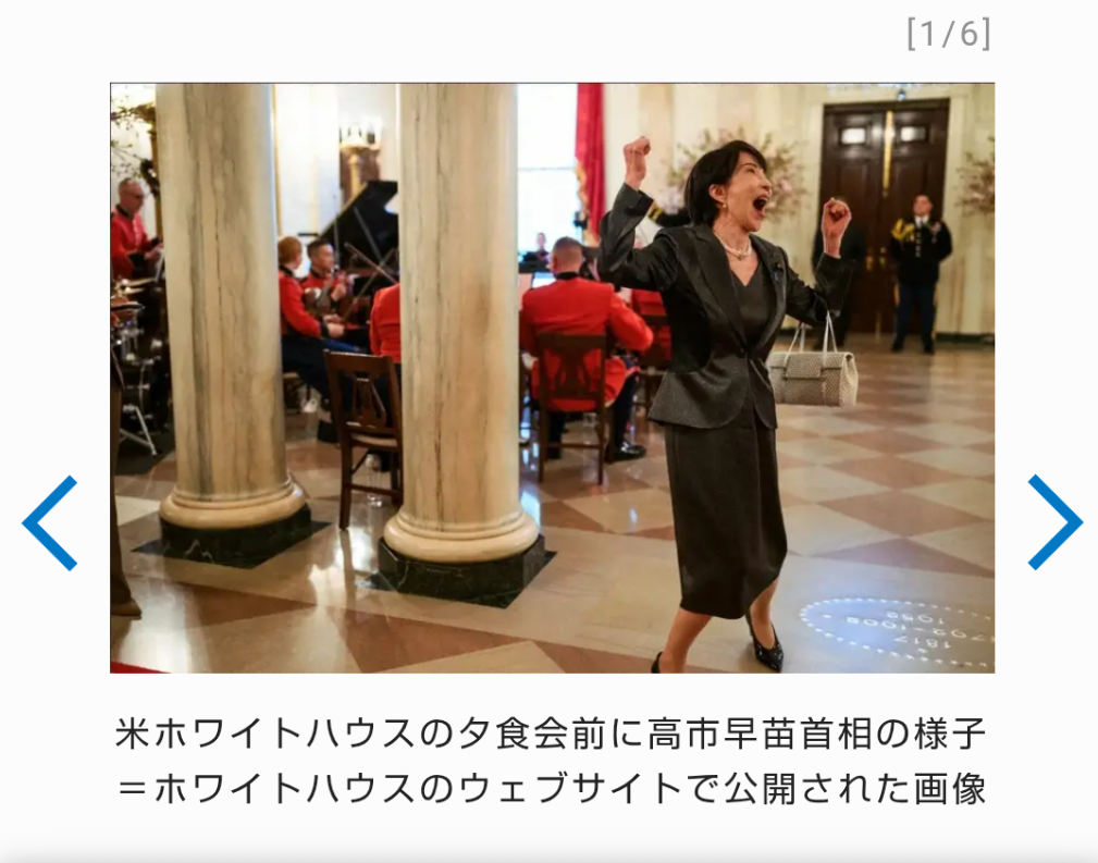 トランプ大統領との首脳会談に際して撮影された写真の中に、黒いセットアップ姿の高市氏が、オーケストラをバックにガッツポーズをとり、絶叫しているように見える写真があったためだ。エネルギッシュな一枚に、SNSでは「AI生成画像ではないか」などと驚く声も上がっていた。