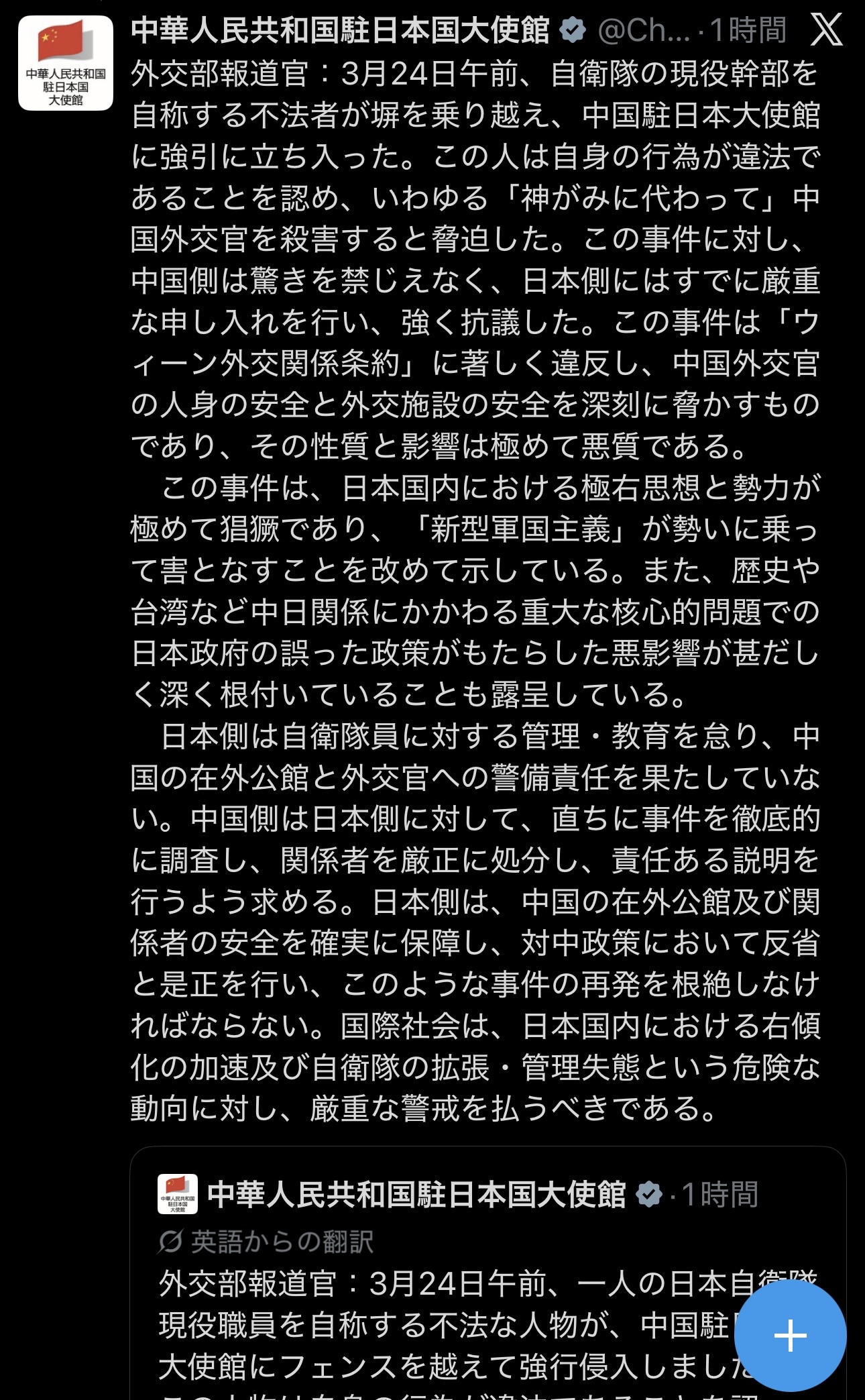 【速報】中国大使館に男性が侵入し確保 自衛隊所属の20代3等陸尉、刃物所持との情報も ★2 [Hitzeschleier★]