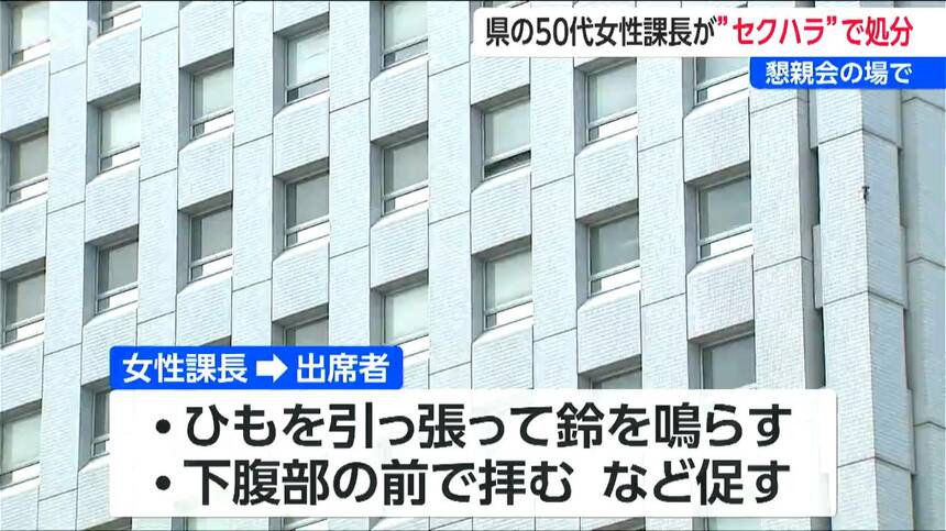 2025年7月に開かれた新潟県観光文化スポーツ部の懇親会で、50代の女性課長が、男性職員に下腹部に鈴とひもが付いた衣装を着せたうえで、懇親会の出席者たちには、そのひもを引っ張って鈴を鳴らしたり男性職員の下腹部の前で拝んだりするように促したということです。
