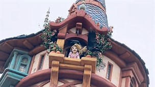 ラプンツェルの姿は、ボートから見上げる塔の上に見えてくる。窓から顔を出したラプンツェルが、映画のテーマ曲を歌っている様子が再現されている。