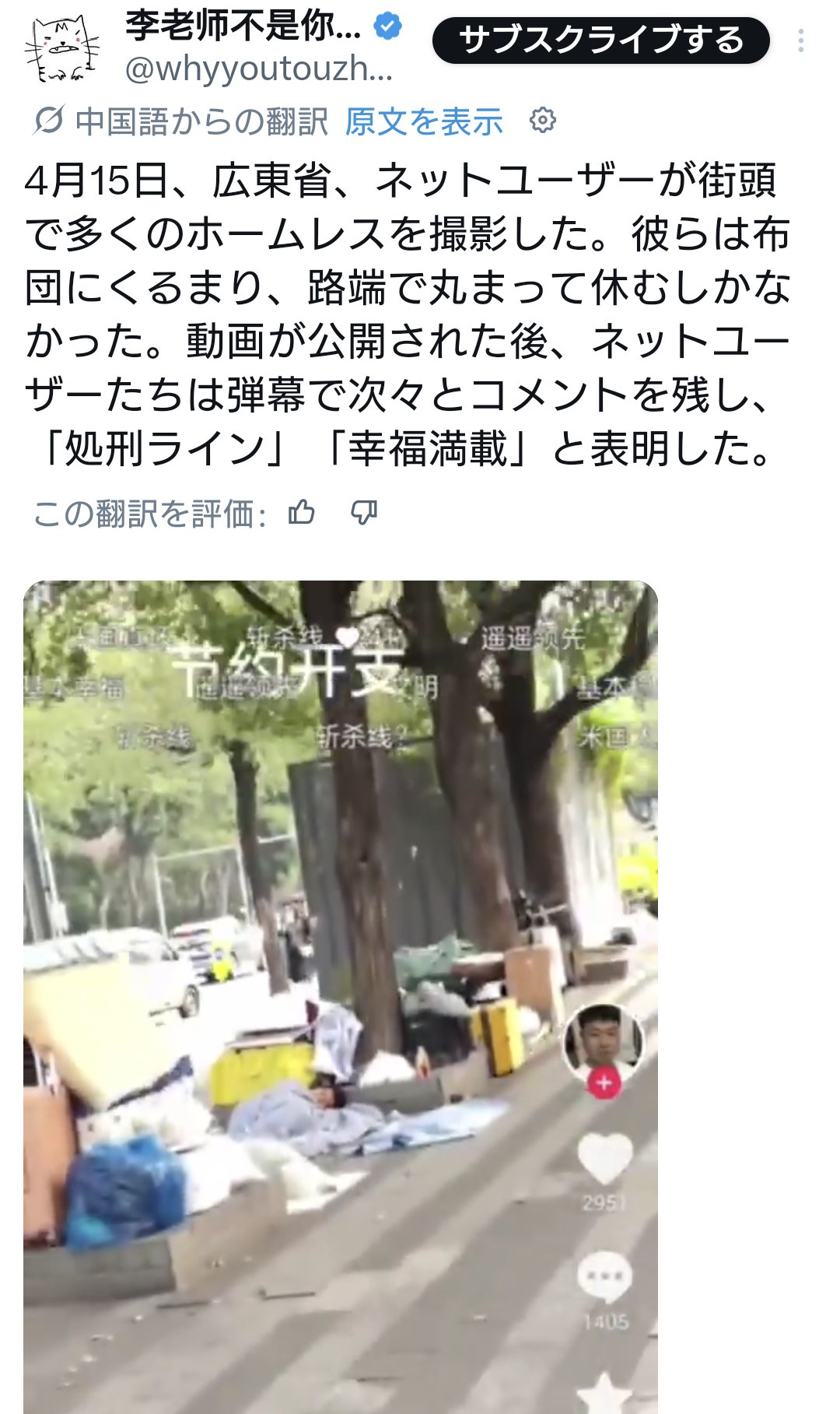 4月15日,广东省,网友拍到街头有不少无家可归的人,只能裹着被子蜷缩在路边休息。视频发出后网友们纷纷在弹幕留言表示:“斩杀线”“幸福满满” pic.twitter.com/uZzadsu8Ct