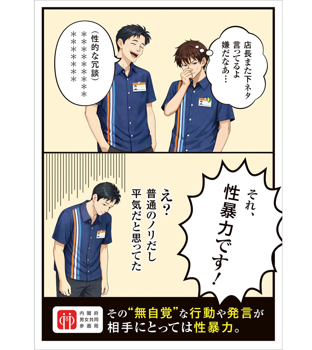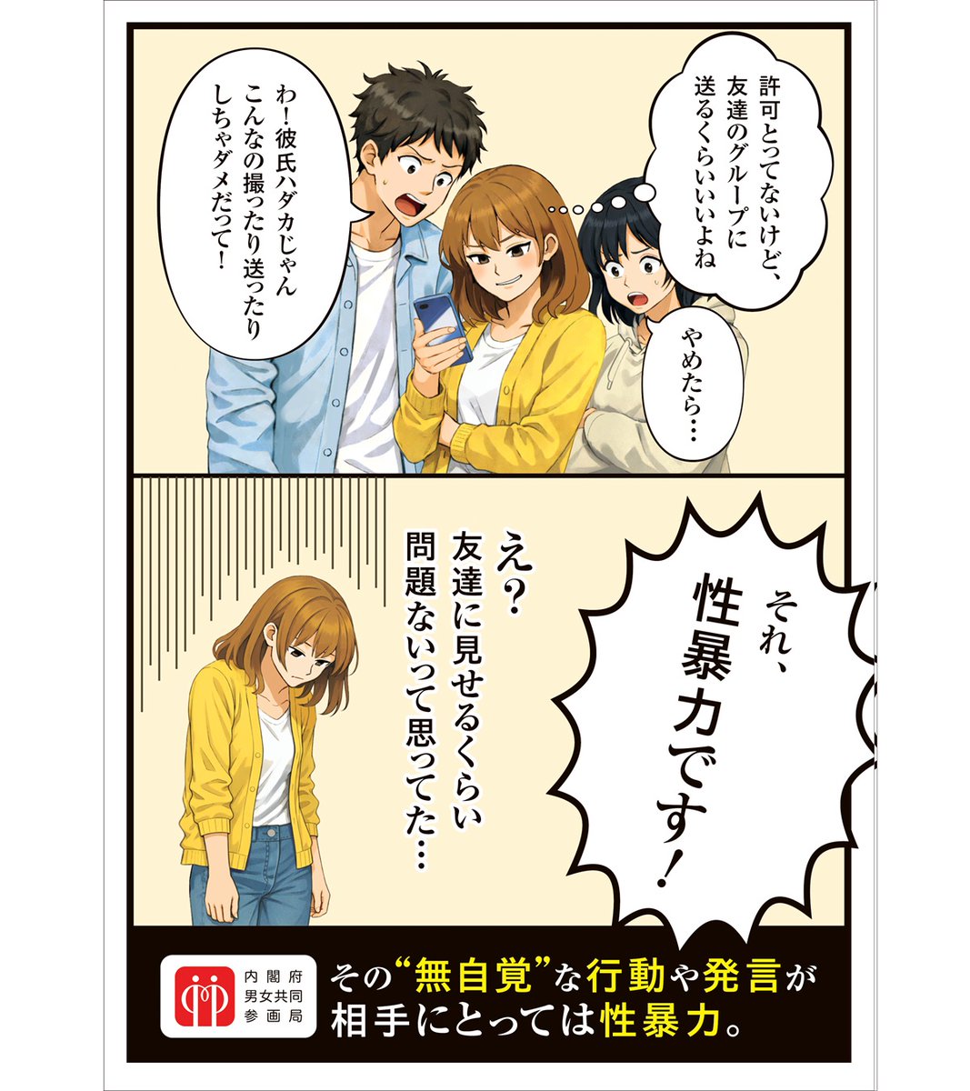 内閣府男女共同参画局が4月20日に投稿した「若年層の性暴力被害予防月間」の啓発漫画が、物議を醸している。性的な発言や画像の送信など、さまざまな性暴力への注意を呼びかける内容だが、公開された複数のイラストで、加害者が女性、被害者が男性として描かれている。