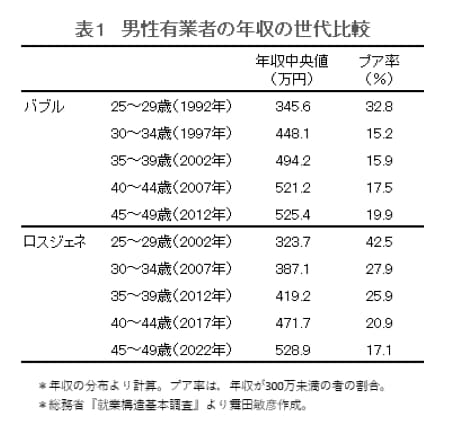 <表1>に示した5つの年次の年収中央値を合計すると、バブル世代は2335万円で、ロスジェネは2131万円。単純に考えると、20代後半から40代までの25年間の稼ぎの総額は、前者が1億1673万円、後者が1億654万円(5つの年次の合計値を5倍)。40代までの稼ぎの総額に、1000万円以上の開きが出ている。給料が高い50代を経て、支給される退職金も考慮すると、バブルとロスジェネでは生涯賃金に2000万円、場合によっては3000万円以上の差が出るかもしれない。