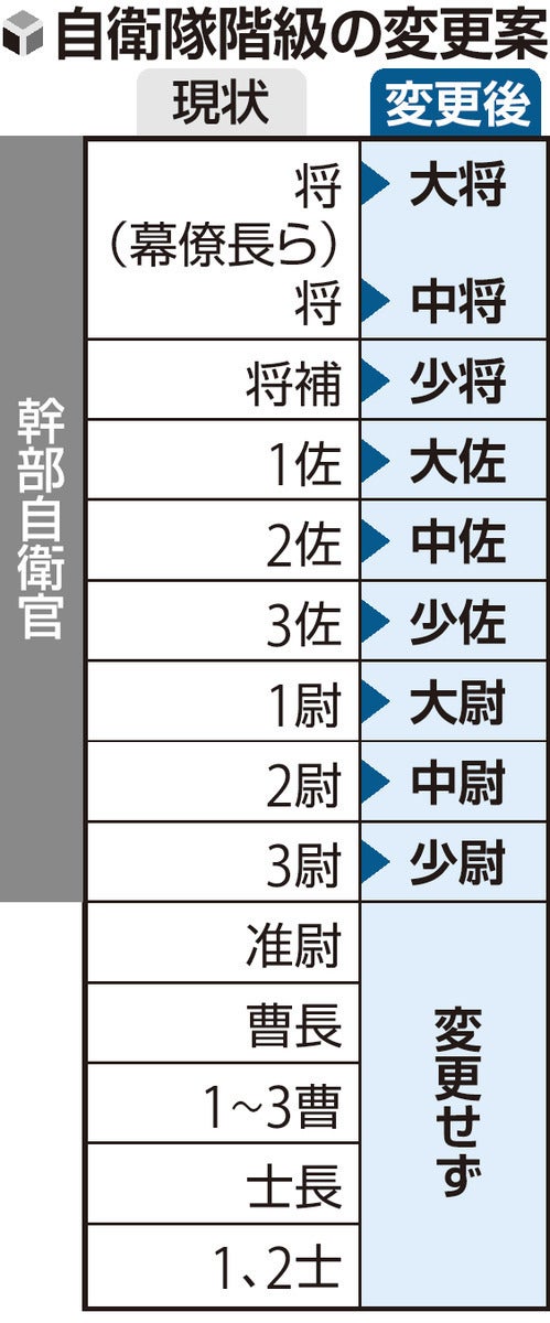 対象は「准尉」を除く尉官以上の幹部で、将補を「少将」、2佐を「中佐」、3佐を「少佐」、1尉を「大尉」などに変更する。数字の階級表記は、国民から1佐と2佐でどちらが高位なのか分かりにくいとの指摘が出ていた。