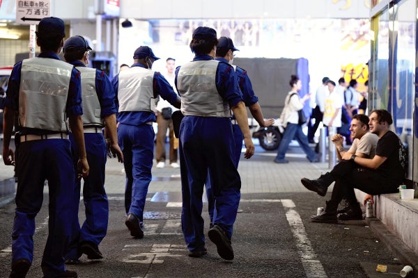 路上で飲酒している外国人に声を掛ける警備員(2023年9月、東京都渋谷区で)