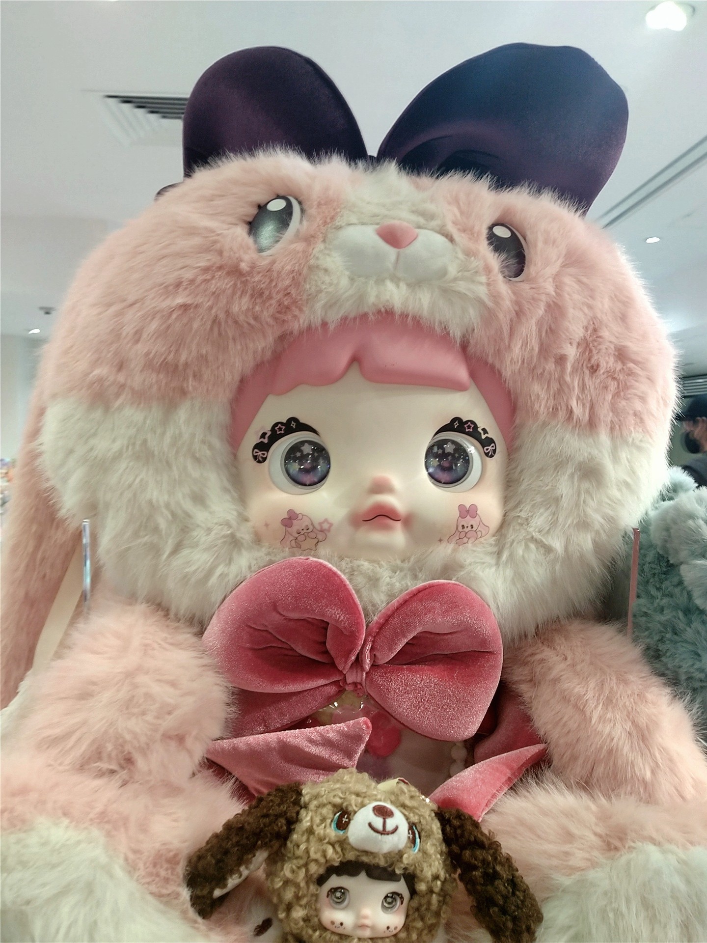 22歳の会社員の2人組は、「ミュウミュウ」や「ルイ・ヴィトン」のバッグに大きめのぬいぐるみを一つだけ。人気イラストレーター・mikkoさんのキャラクターに、中国発「ポップマート」の「ラブブ」。どちらも話題のぬいぐるみだ。「バッグに大きめのぬいぐるみをつけるのがはやっているので」つけたという。