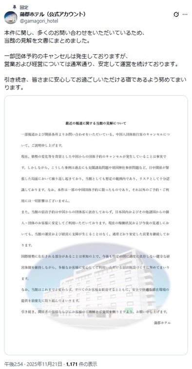 愛知・蒲郡市にある「蒲郡ホテル」が21日に公式X(旧ツイッター)に文書を掲載し「見解」を示した。