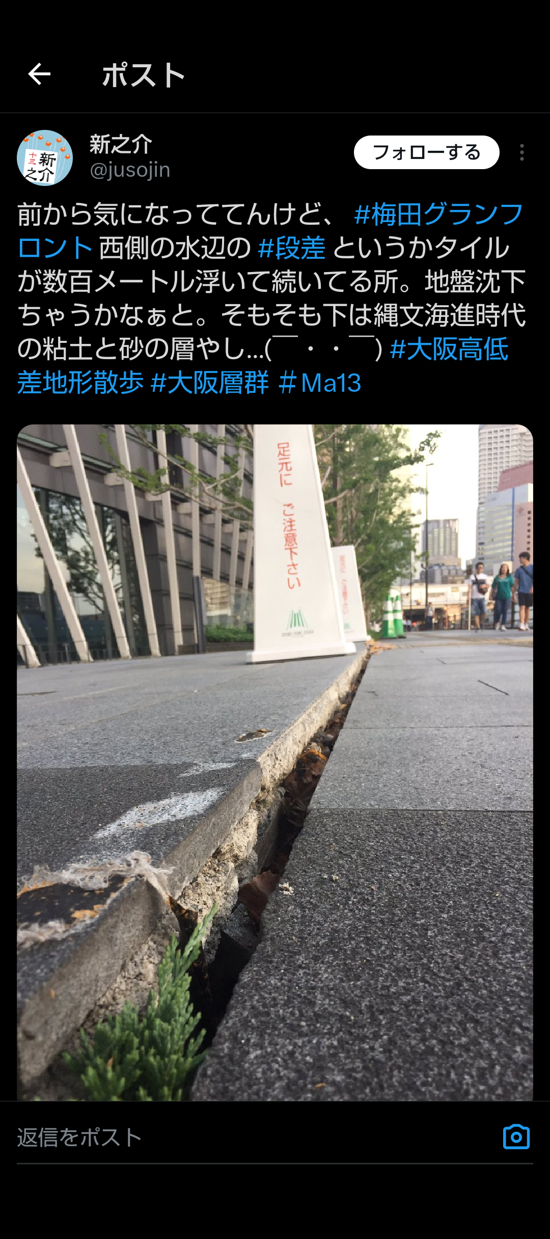 前から気になっててんけど、 #梅田グランフロント 西側の水辺の #段差 というかタイルが数百メートル浮いて続いてる所。地盤沈下ちゃうかなぁと。そもそも下は縄文海進時代の粘土と砂の層やし…( ̄・・ ̄) #大阪高低差地形散歩 #大阪層群 #Ma13
