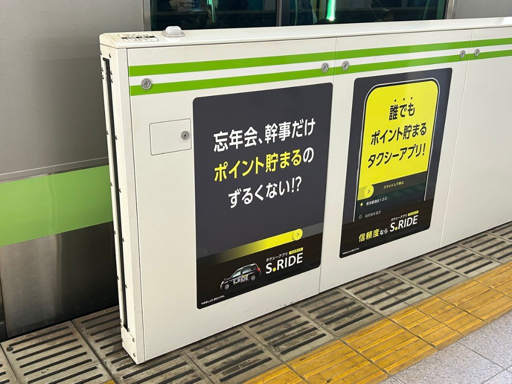 物議をかもしたのは、鉄道駅のホームドアに掲出されていたアプリの屋外広告。「忘年会、幹事だけポイント貯まるのずるくない!?」と、忘年会の会計時に支払いを任される幹事の利点を強調した上で、「誰でもポイント貯まるタクシーアプリ!」とアプリのメリットを伝える広告でした。